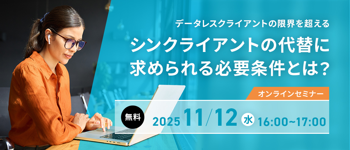 本セミナーでは、企業が求められる情報セキュリティの要件を整理し、シンクライアントの限界について解説します。そのうえで、データレスクライアントがその代替となるか、保護範囲とパフォーマンスの観点から検証し、真の意味で“データレス”を実現するための手段を紹介します。セキュリティ強化とユーザビリティ向上の両立を目指している企業様は是非ご参加ください。